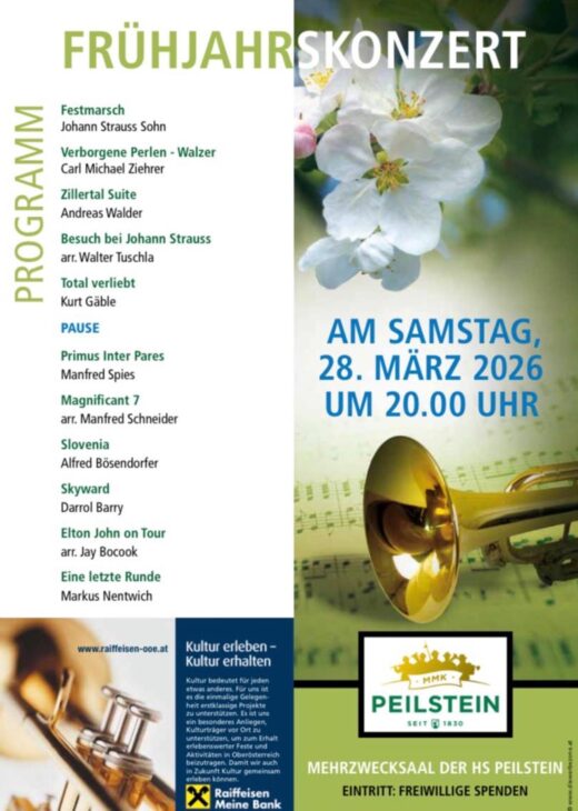 Wir möchten euch ganz herzlich zu unserem Frühjahrskonzert am Samstag den 28. März 2026 um 20:00 Uhr in der Mehrzweckhalle der NMS Peilstein einladen! 🎺🗓️ Wir freuen uns auf euer Kommen! 🎶💚