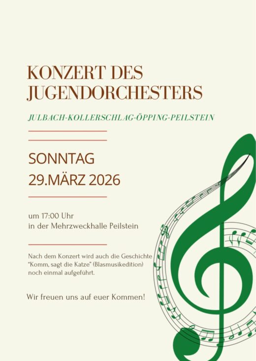 Das Jugendorchester Julbach-Kollerschlag-Öpping-Peilstein lädt am Sonntag, 29. März 2026 um 17:00 Uhr sehr 💚-lich zum Konzert in die Mehrzweckhalle Peilstein. 🎶🤩 Die Jungmusiker:innen freuen sich auf zahlreichen Besuch! 😊